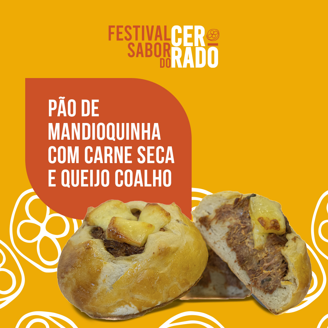 Pão de mandioquinha com carne seca e queijo coalho: O Pão de mandioquinha com carne seca e queijo coalho é uma verdadeira experiência de sabor. A suavidade da mandioquinha na massa traz um toque levemente adocicado, que contrasta perfeitamente com o recheio suculento de carne seca desfiada e o queijo coalho, famoso por seu sabor inconfundível. Cada mordida é um convite para desfrutar da riqueza dos ingredientes típicos do cerrado, criando uma delícia autêntica e acolhedora, perfeita para qualquer momento do dia!