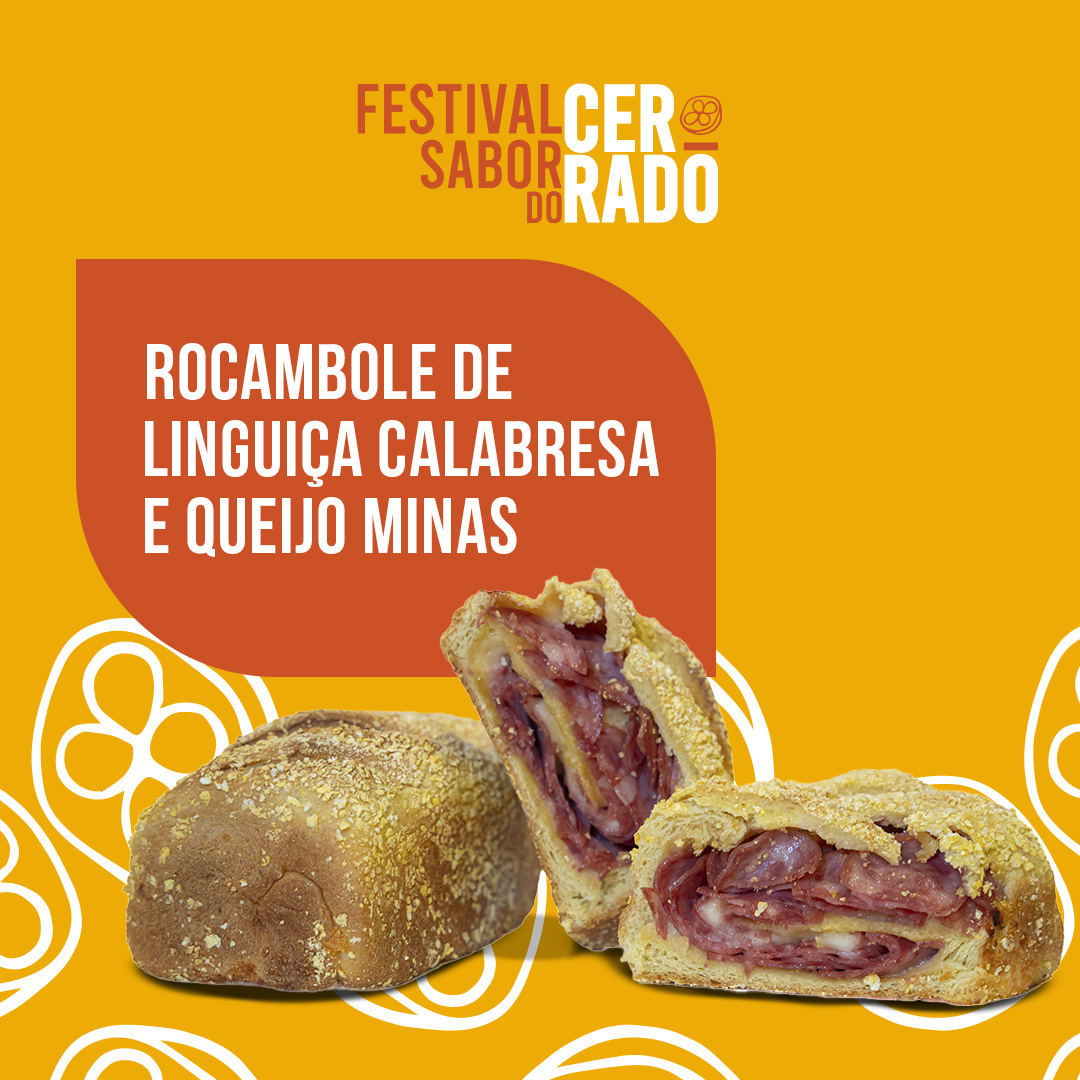 Rocambole de linguiça calabresa e queijo minas: O Rocambole de linguiça calabresa e queijo minas combina o sabor intenso e levemente picante da linguiça calabresa com a suavidade do tradicional queijo minas. O recheio é envolto em uma massa de pão macia e dourada de pão de milho, em uma harmonização irresistível com um toque de rusticidade que homenageia a simplicidade e riqueza culinária do cerrado.