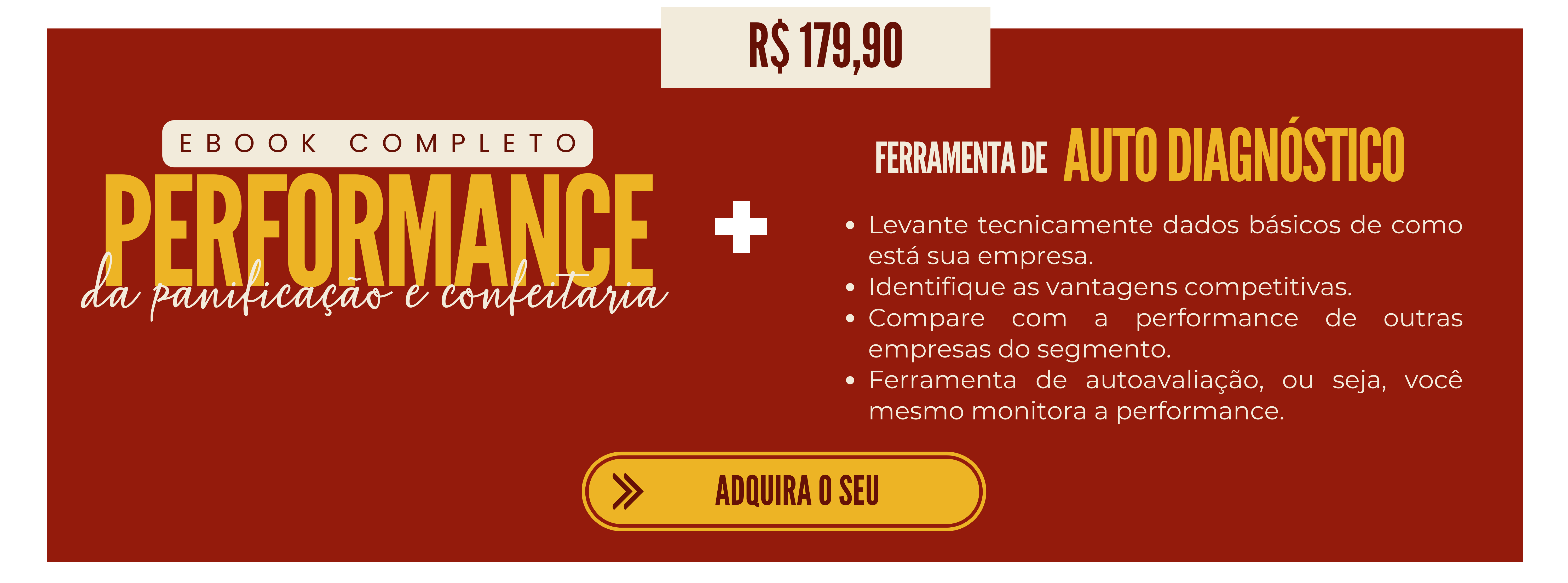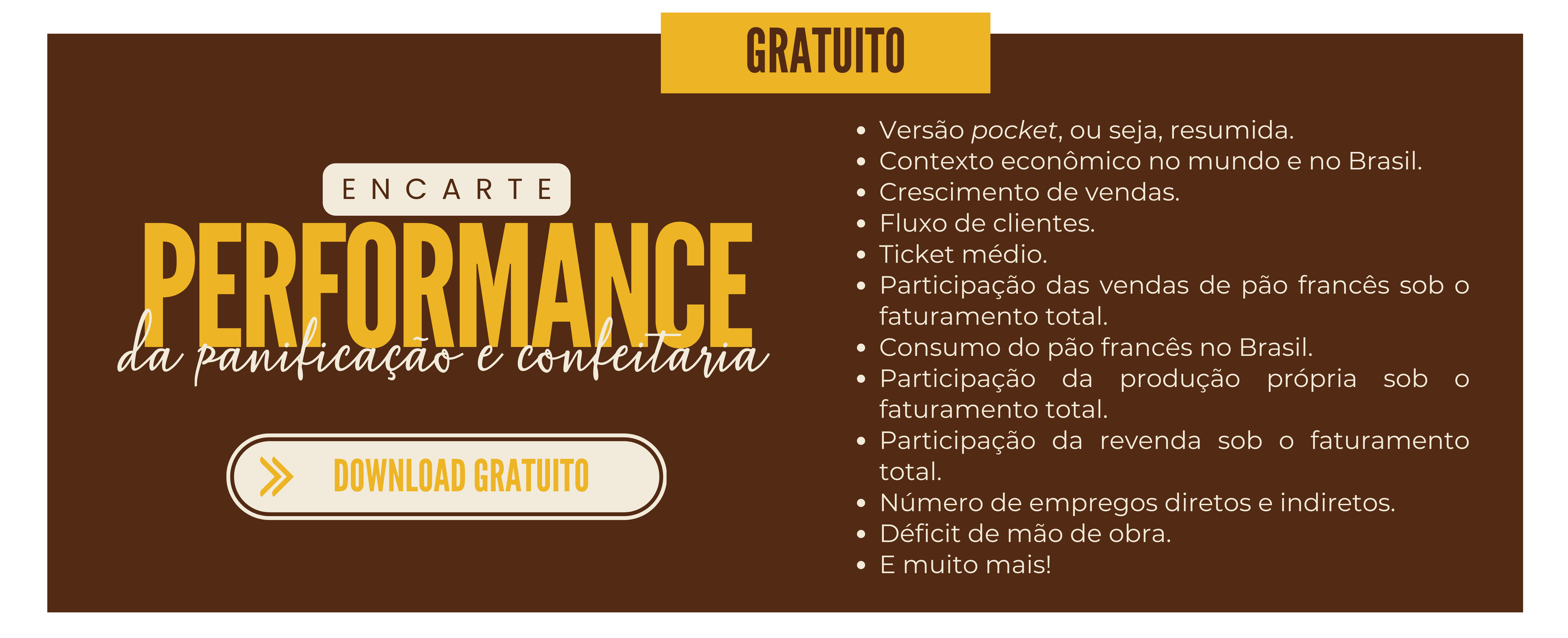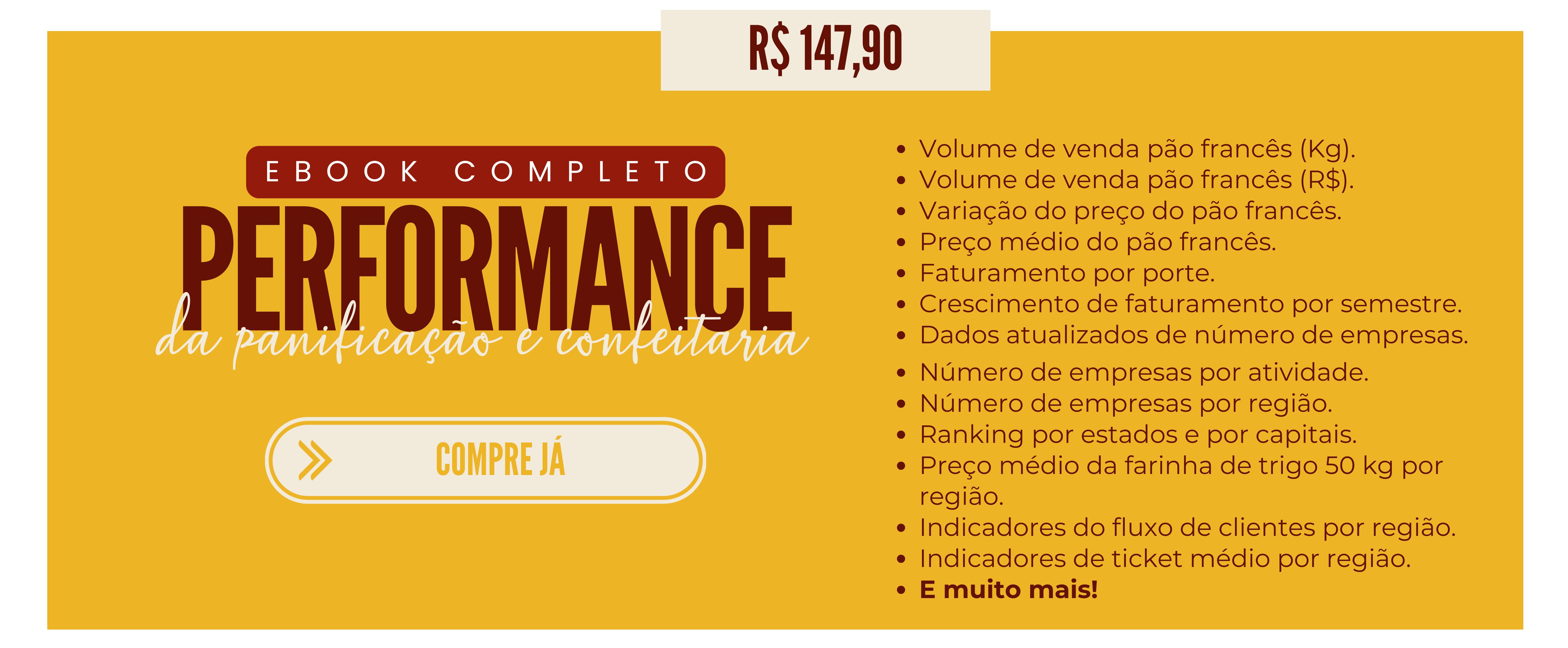 Mas, para quem quer ir além, o caminho é obter um ebook completo com o raio X do setor. No ebook Performance da Panificação e Confeitaria 2023 você terá acesso aos indicadores de produtividade; aos relativos a venda do pão francês em volume e preço por região; ao mapeamento de número de empresas por cidade e por capital; aos dados de faturamento por porte e por região; preço médio da farinha de trigo por região; estratificações de ticket médio e fluxo de clientes por região do Brasil e muito mais.